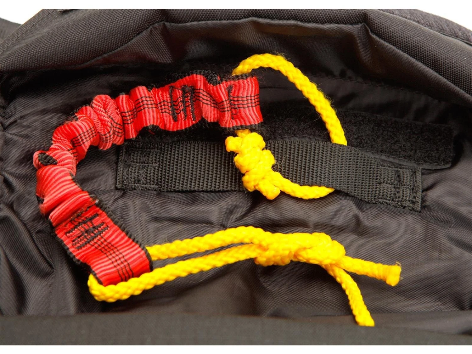 Die Schleppleine enthält 15m schwimmfähiges Seil mit Ruckdämpfer, einen hochwertigen Karabiner und dazugehörigen Schwimmkörper, sowie einen Hüftgurt mit Schnellverschluss und Edelstahlring.
