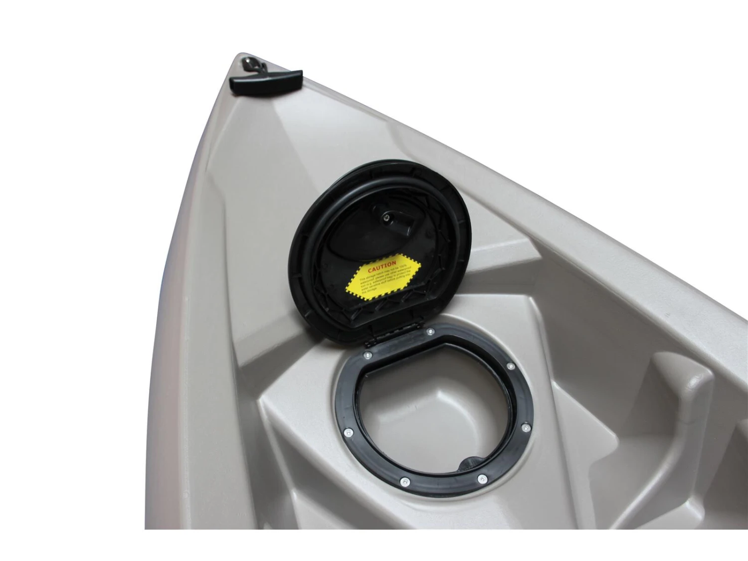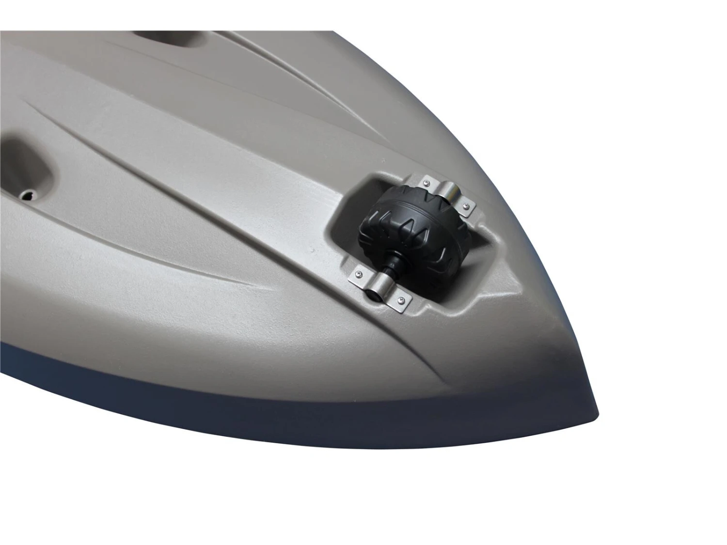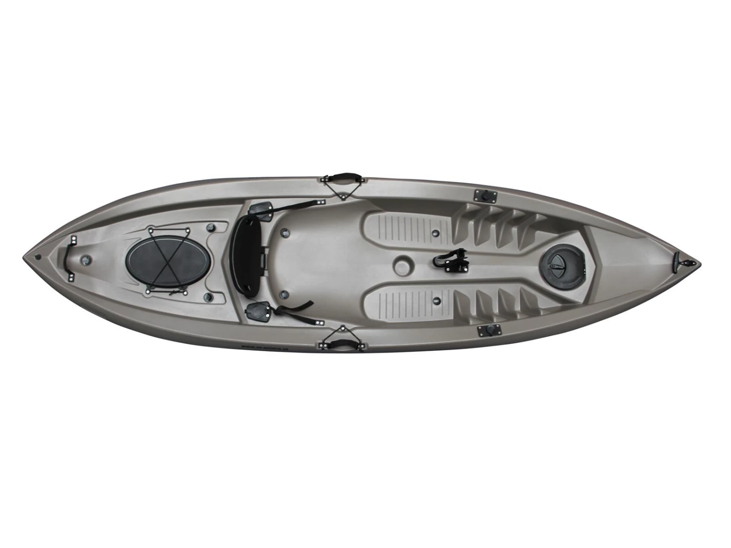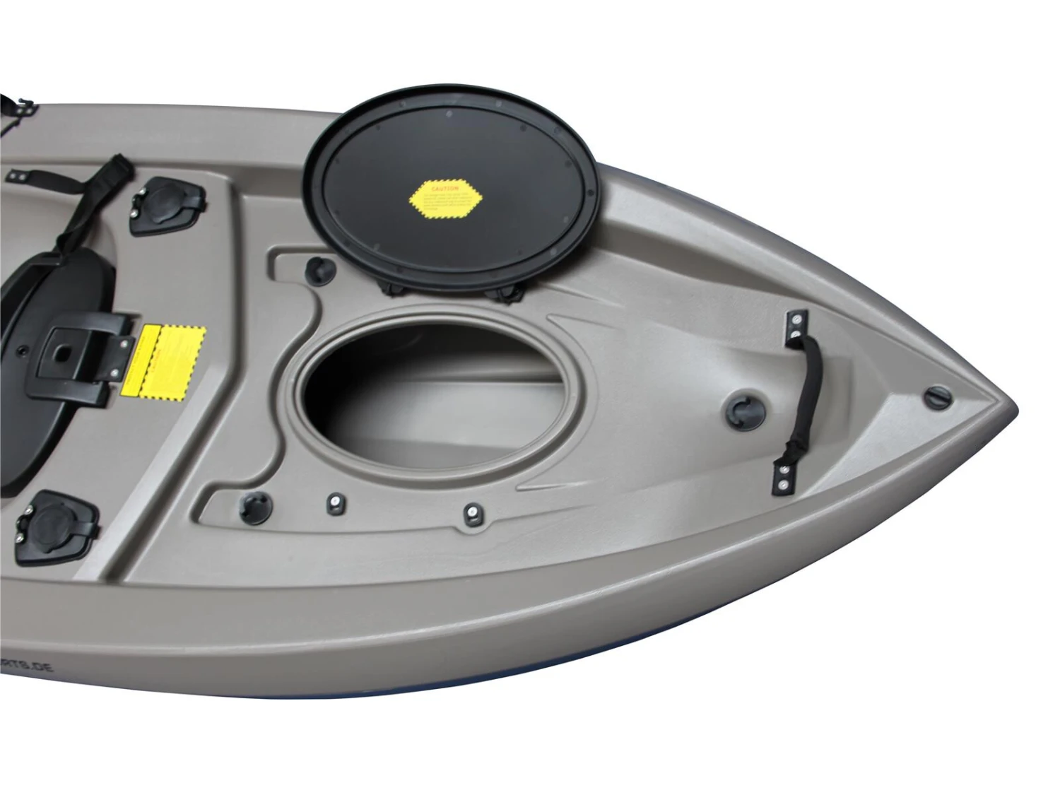 Dieses Angelkajak besitzt zum leichten Transport zum Wasser hinten eine Rolle. Es ist zusätzlich ausgestattet mit zwei einfachen Rutenhaltern neben der Rückenlehne und einem verstellbaren Rutenhalter vorn. Ausserdem besitzt es zwei Ladeluken.