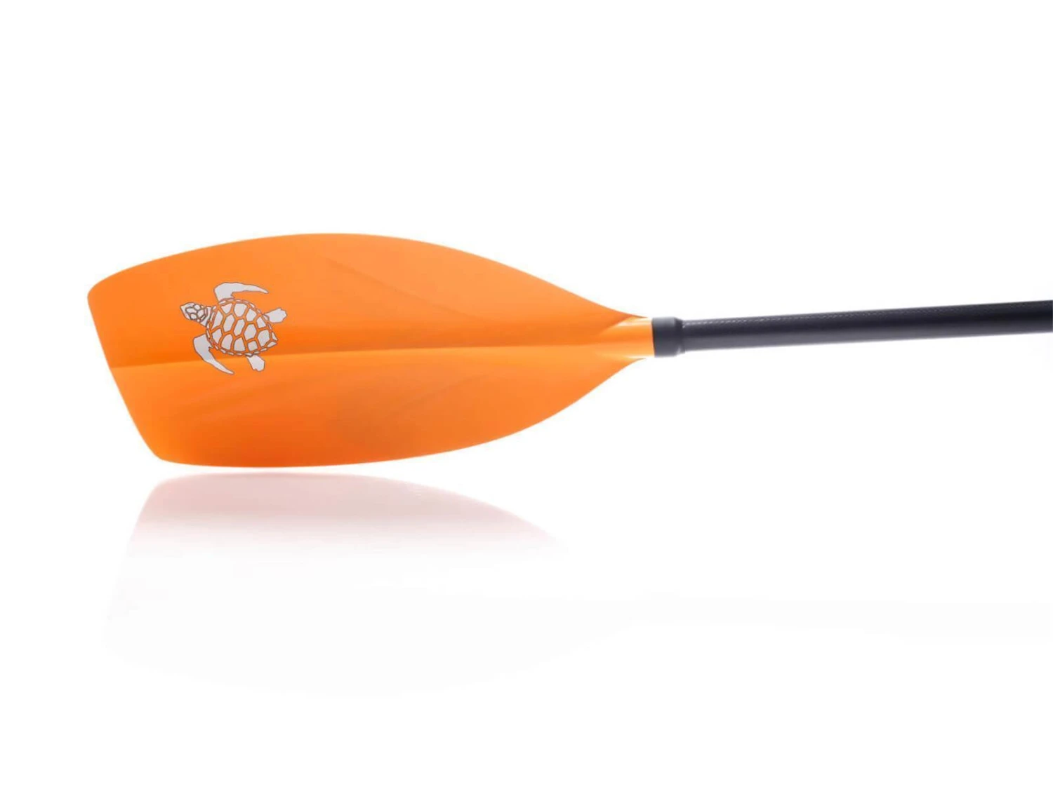 Anders als bei den HE Modellen sind die Paddelblätter mit Glasfasern verstärkt. Die Besonderheit: Die Blätter können eingefärbt werden, die aktuelle Farbe ist leuchtorange. Diese Signalfarbe ist weithin sichtbar, was nicht nur auf Fotos von Vorteil ist. Ein buntes Paddel zeigt sich selbst in der trübsten Brühe.