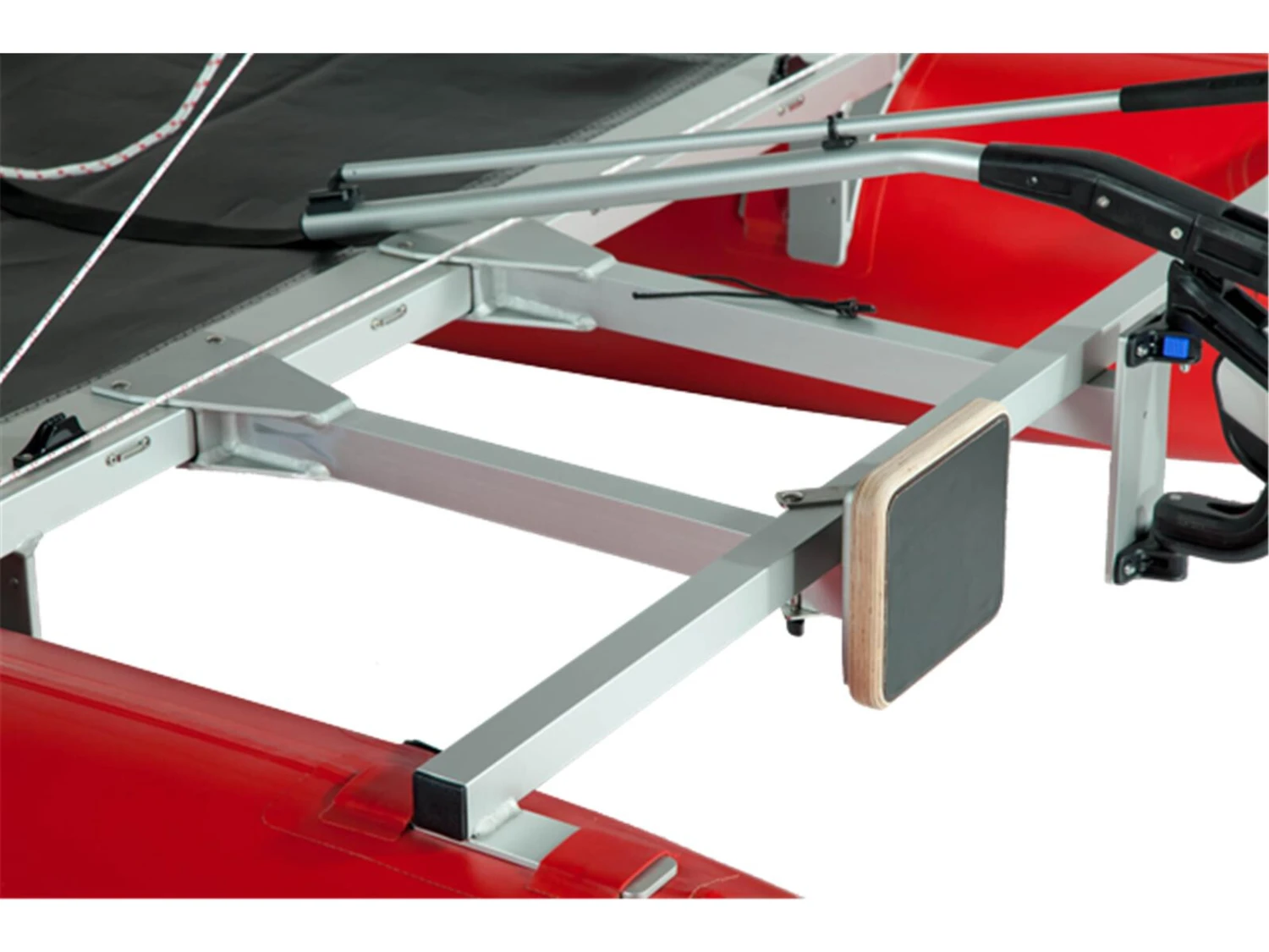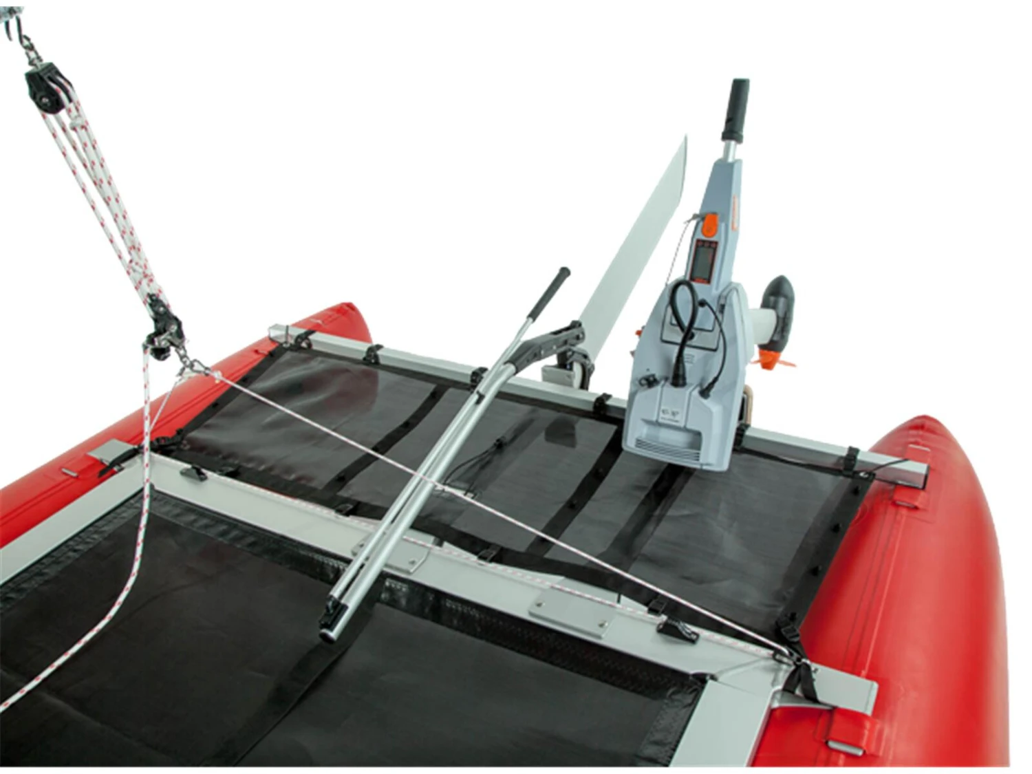 Wird am Rahmen mit 2 Flügelschrauben angeschraubt und mit der HURRICANE Heckstrebe (Zubehör) verbunden. Der Motor kann auch bei Verwendung vom Heckverdeck und beim Segeln montiert bleiben.