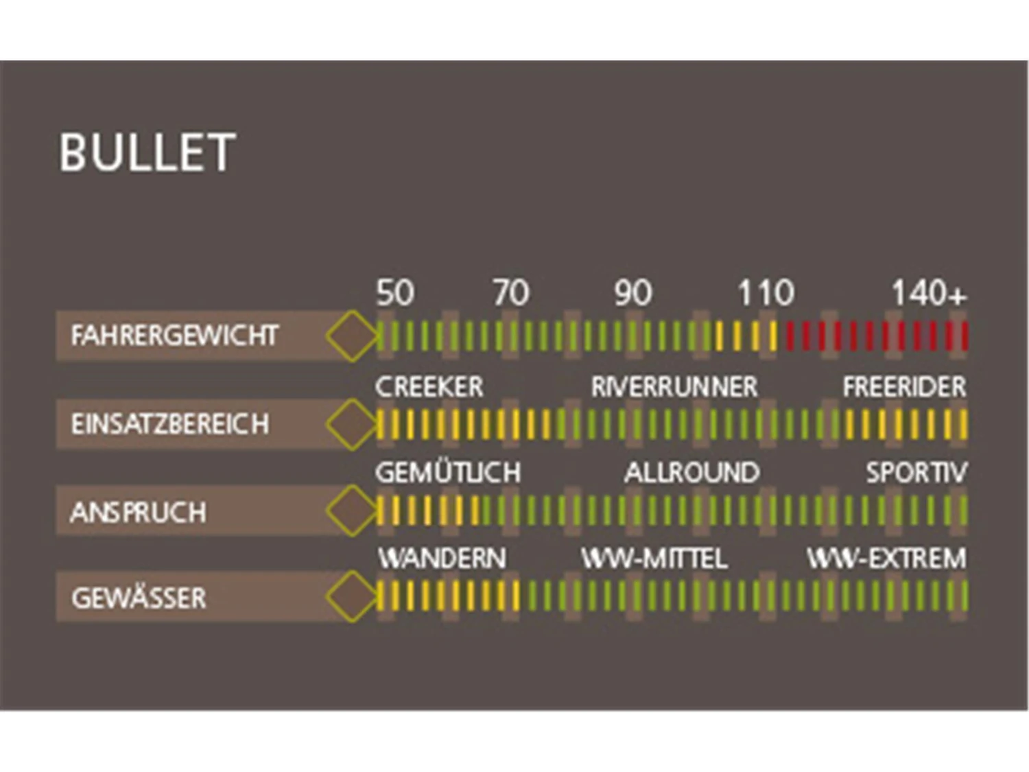 Der flache Unterboden gibt dem Bullet eine hohe Anfangsstabilität und macht ihn besonders wendig. Die ausgeprägte Kante im Unterschiff lässt ihn sauber ins Kehrwasser laufen und gibt viel Führung auch bei starken Seitenströmungen. Das voluminöse Vorderschiff lässt den Bullet schnell und kontrolliert auftauchen, das Volumen im Heck sorgt für viel Sicherheit auch im schweren Wildwasser. Durch die Länge von 2,55 Metern und die geringe Breite ist der Bullet ein sehr schnelles und dynamisches Wildwasserkajak. Einsteiger lieben den Bullet aufgrund seiner gutmütigen Eigenschaften. Trotzdem darf man mit dem Bullet im Wildwasser nicht rumdümpeln; er erfordert von Anfang an eine dynamische Fahrweise. So fördert er eine stete Verbesserung der Paddeltechnik. Fortgeschrittene und Profis schätzen den Bullet im verblockten wie im wuchtigen Wasser. Er ist wendig und dynamisch genug für stark verblockte und steile Flüsse, aber auch spurtreu und schnell genug für wuchtiges Wildwasser.