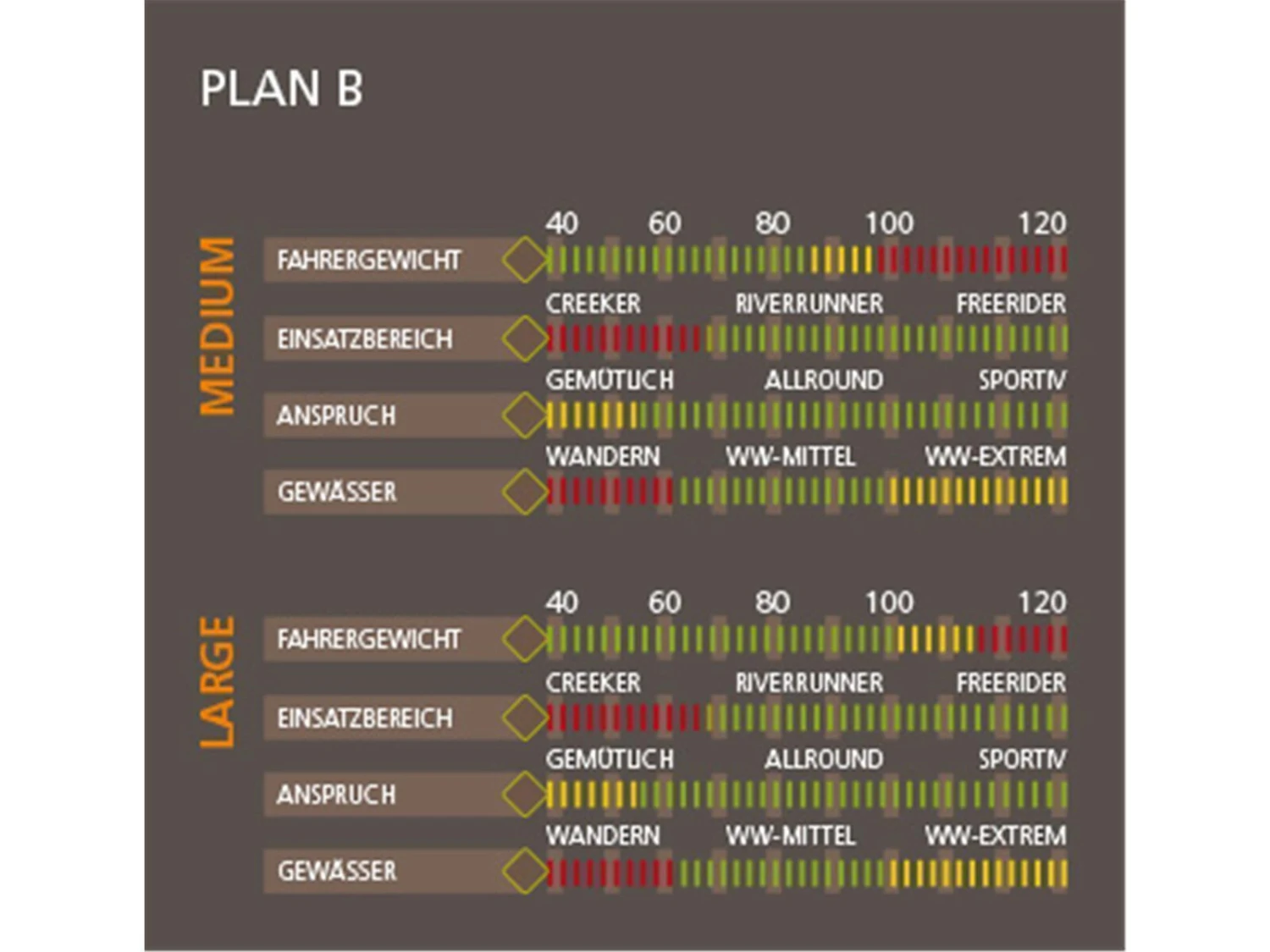 Du hast einen Creeker bereits im Fuhrpark? Dann brauchst Du nur noch ein Boot zusätzlich zum Glücklichsein. Denn keiner weiß besser als wir, dass neben dem klassischen Wildwasserfahren doch das Glück des sportlich ambitionierten Kanuten im Surfen, Splatten, Wheelen und Kerzeln liegt. Um diesen neuen alten Trend des spielerischen Paddelns wieder zu beleben, haben wir tief in die Trick-Kiste gegriffen und einige verspielte Zutaten ans Tageslicht befördert. Diese wären: Ein flaches Unterschiff, scharfe Kanten, schlanke Enden gepaart mit viel Fußraum und ein geräumiges Cockpit. Herausgekommen ist mit unserem Plan B ein scharf gewürzter Riverrunner. Schnapp ihn dir und mach den Bach damit zu deinem Playground! River: Die Ausstattungs-Linie unserer River-Runner. Mit Shockpad und Schaum als Fußstütze sind dieser Boote bequem, sicher und leicht anzupassen. Über die weiteren Optionen könnt ihr die River-Ausstattung noch individuell auf eure Bedürfnisse anpassen, außerdem könnt ihr zwischen zwei verschieden breiten Sitzen wählen. Weitere Ausstattungsdetails / Optionen findet ihr in der Tabelle.