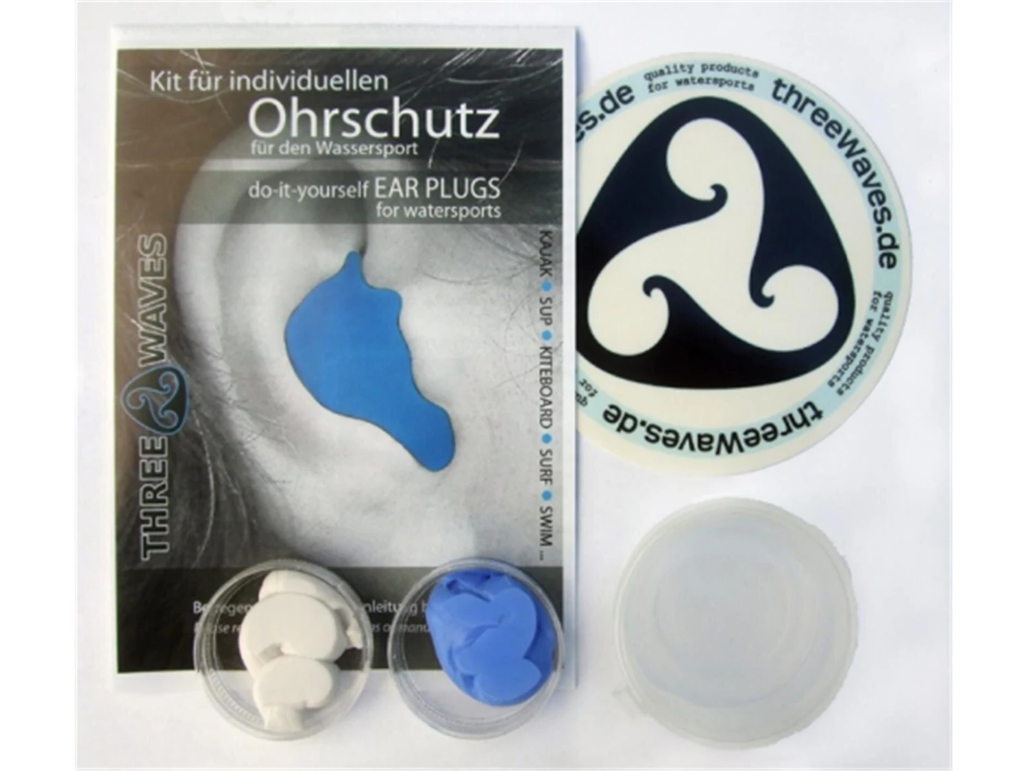 Der Kit besteht aus zwei gleichen Mengen hochwertigem Knetsilikon-Material (blau/weiß), einer ausführlichen, bebilderten Herstellungsanleitung in deutscher und englischer Sprache, einer bruchsicheren Aufbewahrungsdose aus PP mit angebundenem Deckel für den druckfreien und sicheren Transport der fertigen Ohrstöpsel z.. B. in der Schwimmweste.